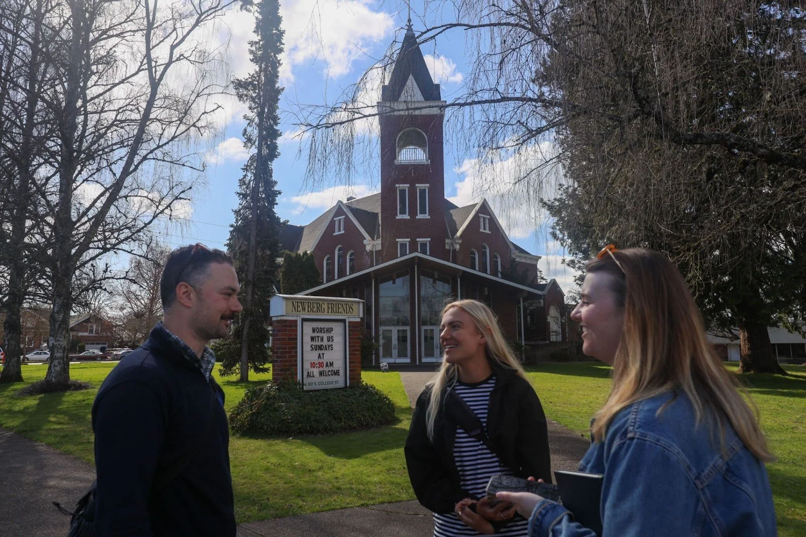 Newberg Friends Church stands as a symbol of the town’s historical Quaker roots. Andersen, now a familiar face, chats with reporters just outside its entrance—another day of teaching the pulse of his community.
