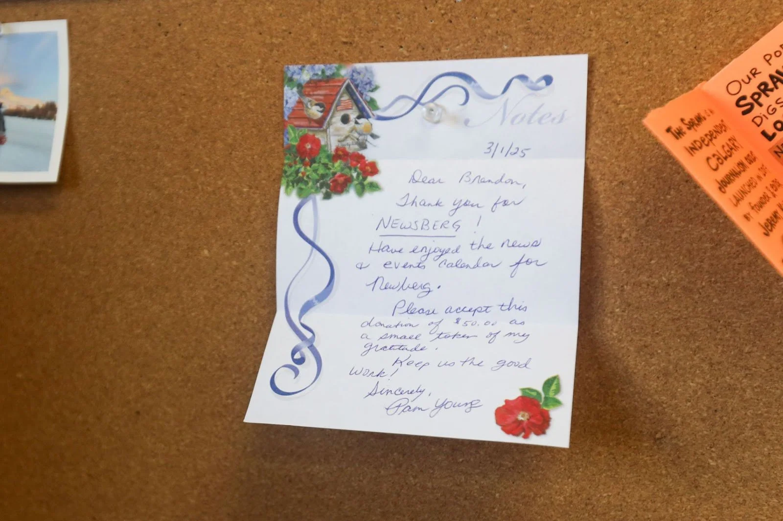 A handwritten note of gratitude pinned inside the Newsberg office showcases the growing local support Andersen has built by fostering trust and connection in the community.
